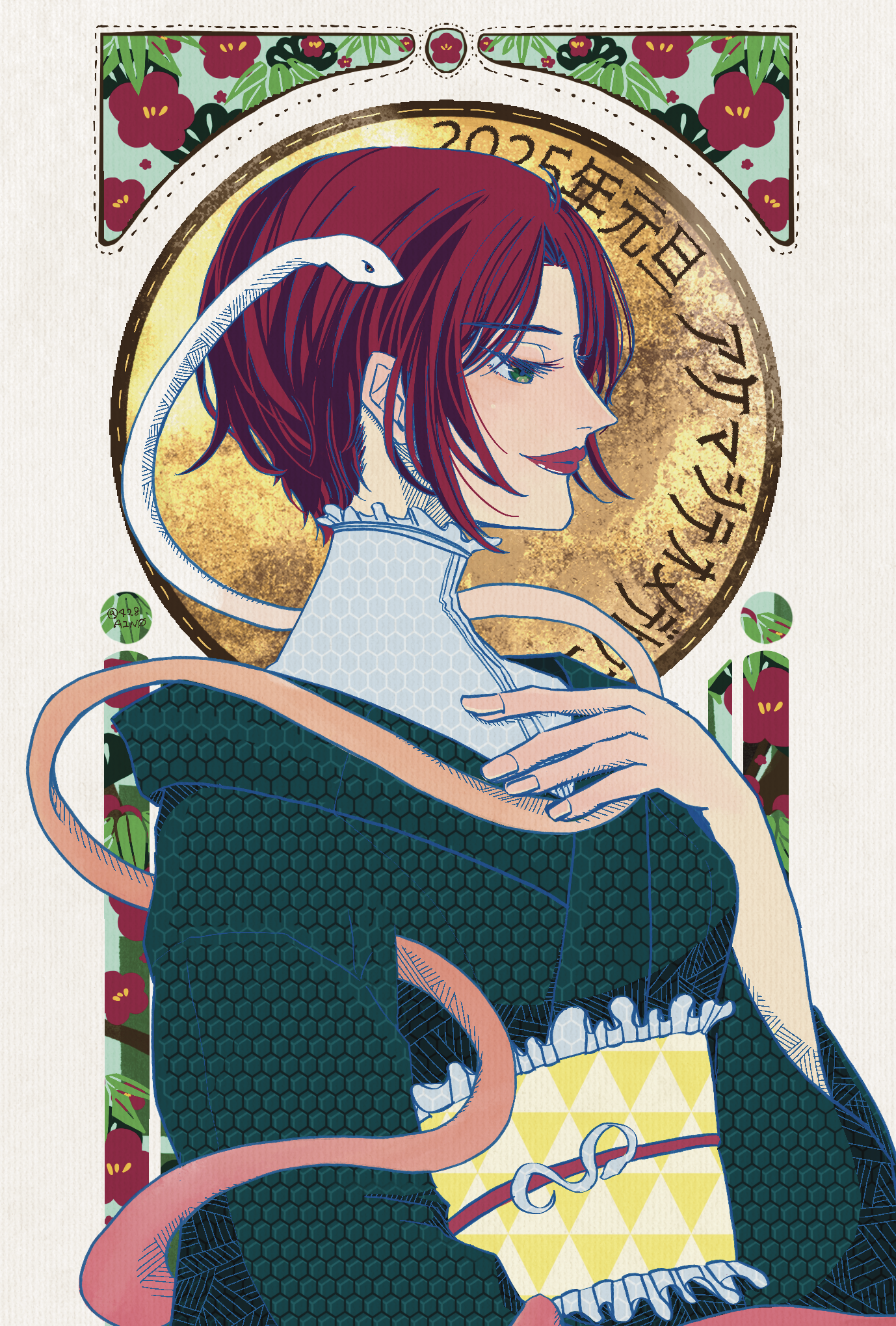2025年年賀状テーマはミュシャ×大正ロマン背景に松竹梅を散りばめたり、着物を書生さん風に着こなしてたり、そもそも大人の女性なので振袖ではなく色留袖だったり、着物の柄は、亀甲紋を蛇の鱗のようにしてみたり、帯は鱗紋だったりといろいろ工夫してい…