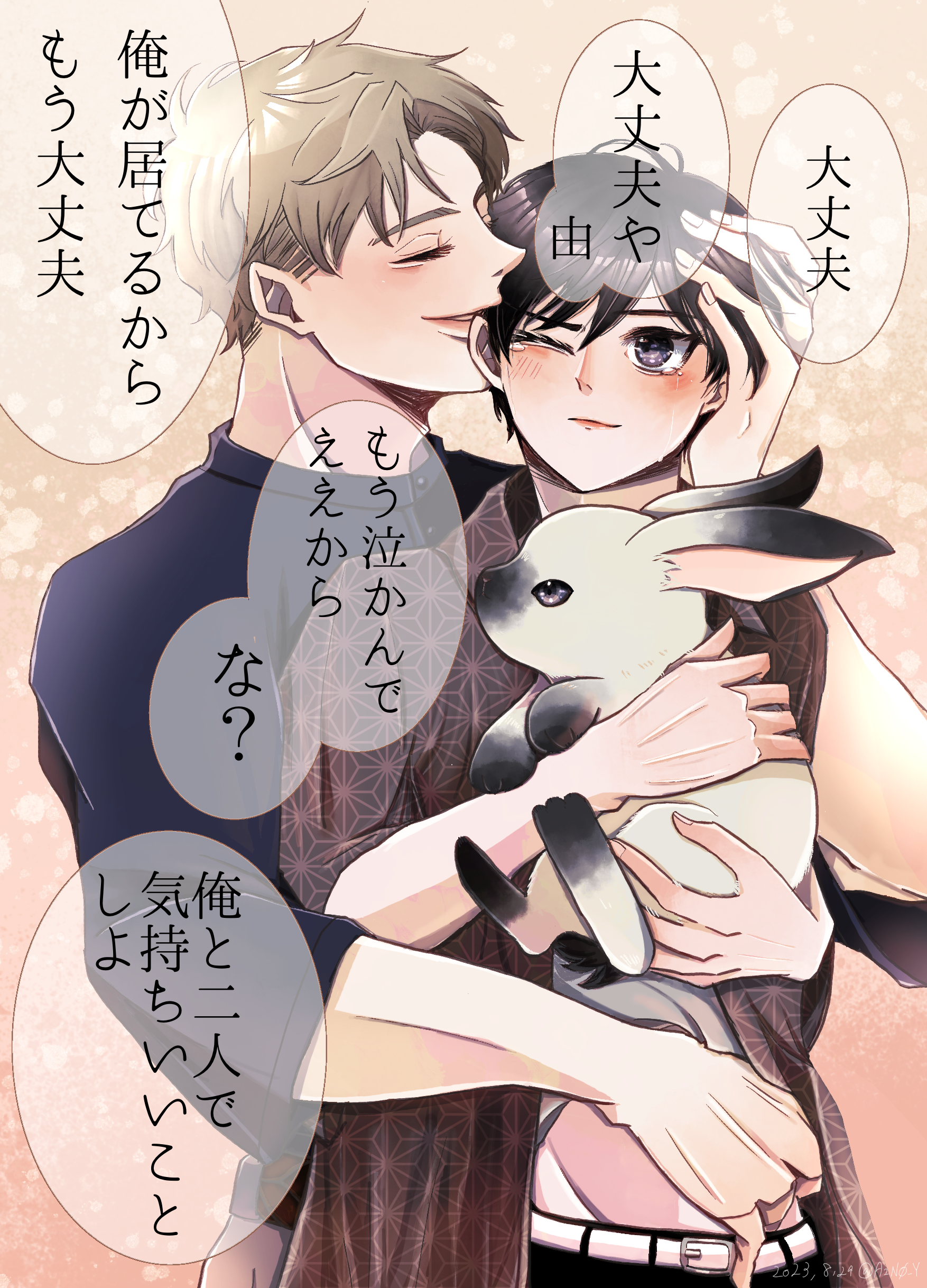 「大丈夫」 大丈夫やから ***** 元々バニーの日用に描いていたんですが(由がウサギちゃんみたいで可愛い、と言うレビューに影響されて)、由を泣かせてしまったところでスイッチが入って、差分を描きました 深野にはこういう一面があっても良いなあと思っています せっかく頑張って描いた体格差が隠れて悔しかったのでそれも載せておきます 画像をクリック/タップで高画質版が表示されます Clap