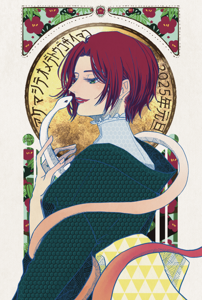 アケマシテオメデトウゴザイマス 2025年年賀状 テーマはミュシャ×大正ロマン こちらは希望があった方にメッセージを書いてお送りしたもの なのでよりヘビと親密な構図と表情です 画像をクリック/タップで高画質版が表示されます Clap