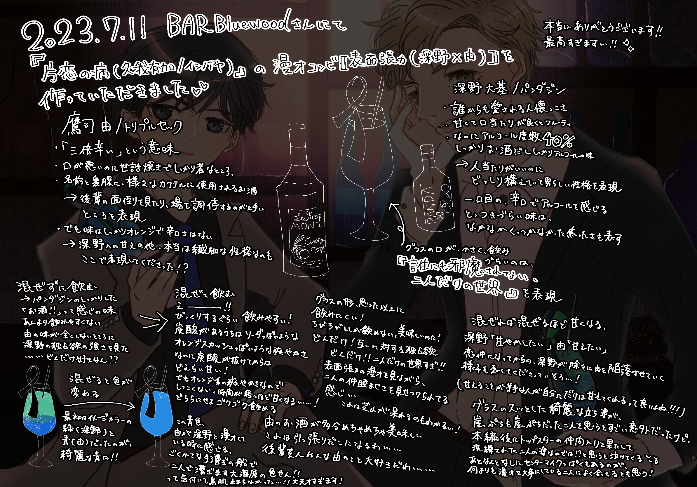 カクテル BAR Bluewoodさんで イメージカクテルをオーダーした記念に描きました味の感想とか使用していただいたお酒のこととかまとめてます→ 画像をクリック/タップで高画質版が表示されます Clap