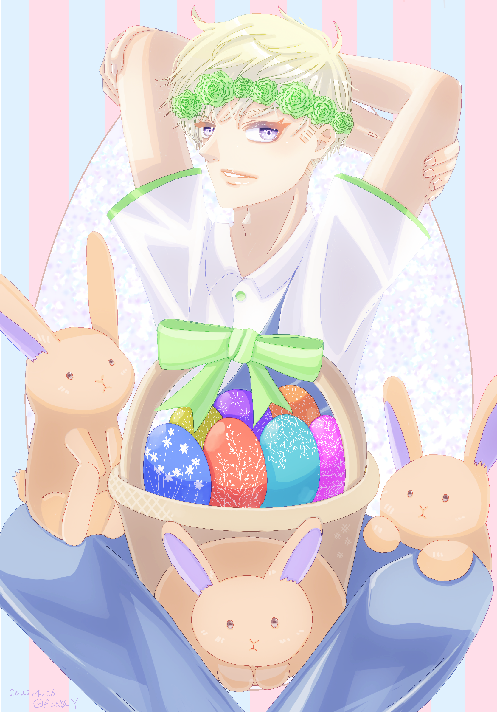 イースターリヒト - 3/4 輝也(2022.4.26) 暁夫のヘアアクセサリを赤色(メンカラ)にしたので、輝也もメンカラの緑にしました リヒトのメンカラは光の三原色、という設定が、この時出来た気がします 輝也の顔つきが鋭いので、うさぎは若干もっちりしたぬいぐるみっぽい感じにして、ギャップを出してみました 画像をクリック/タップで高画質版が表示されます Clap 1 2 3 4
