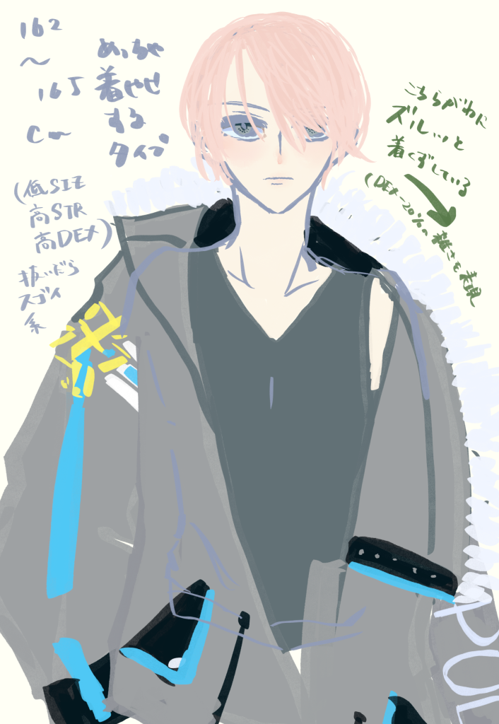 立ち絵を描く前に、衣装デザイン詰めた時のデフォルメ絵と、